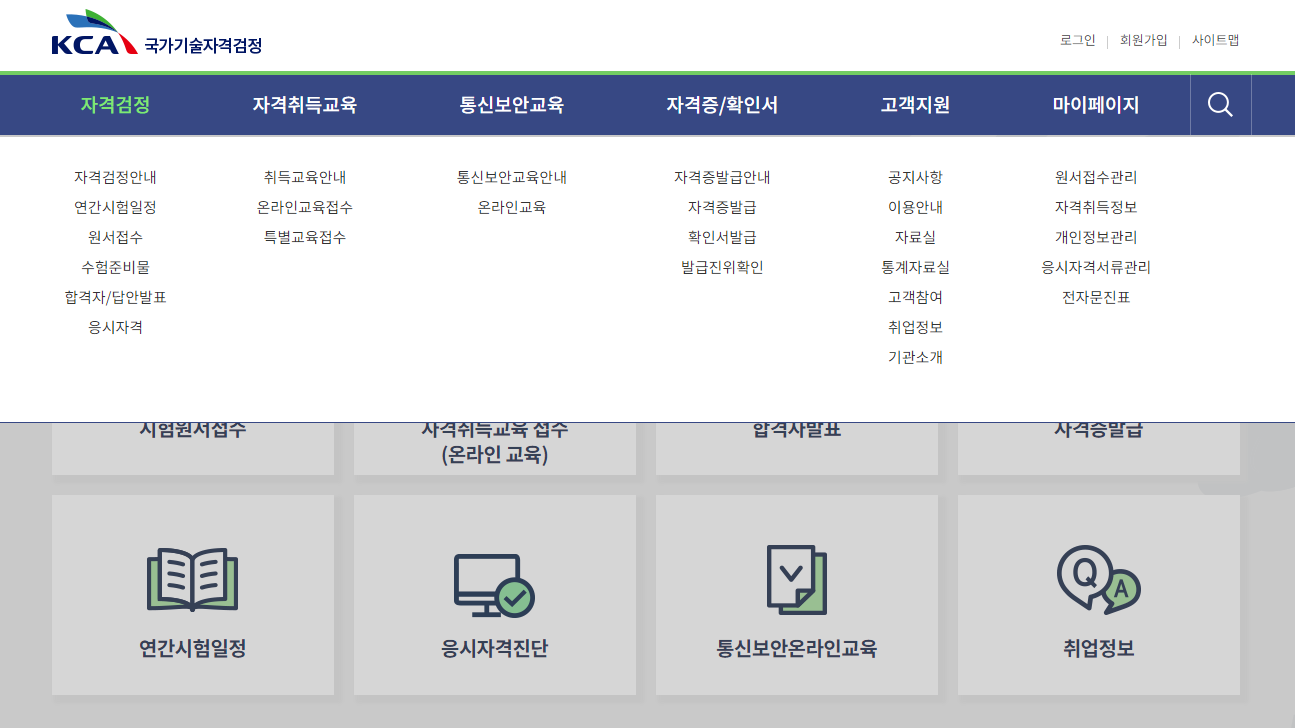 PC 기준입니다. 좌측 상단, 자격검정에 커서를 올리면 메뉴바가 드롭됩니다.