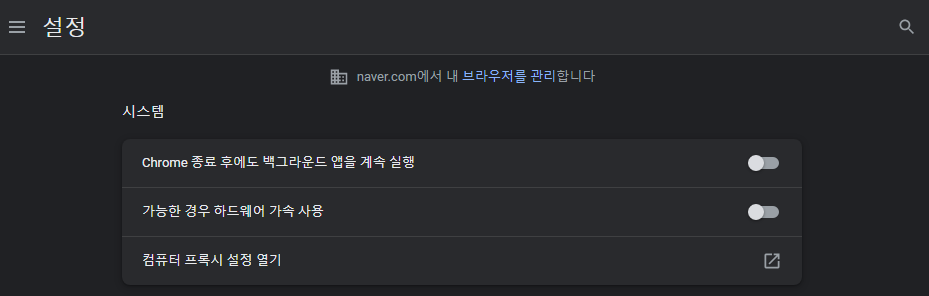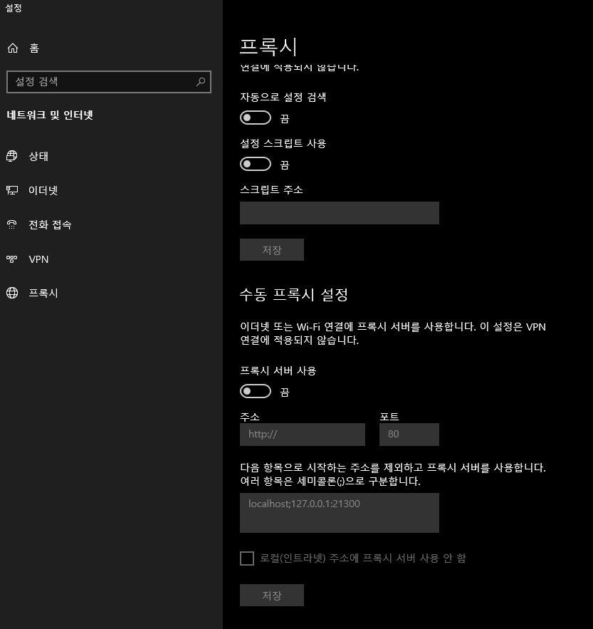 로컬 환경에서 할 것이다. 윈도우 10에서는 저 버튼 하나로 프록시 서버 사용을 on/off 할 수 있게 되었다. 전에 비해 굉장히 편리해진 것 같다.
