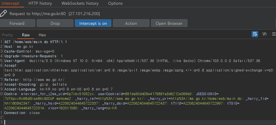 Intercept가 잘 된다. Host에도 주소가 제대로 찍혀있다.
