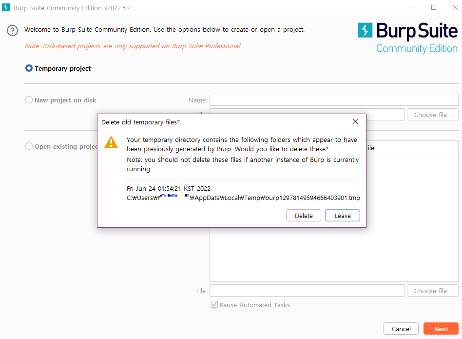 임시파일이 있다고 한다. 노트: 네가 또 다른 버프스위트 인스턴스를 돌리고 있다면 지우기ㄴㄴ