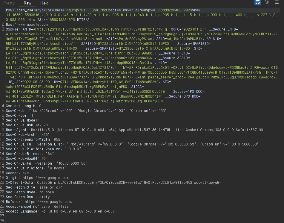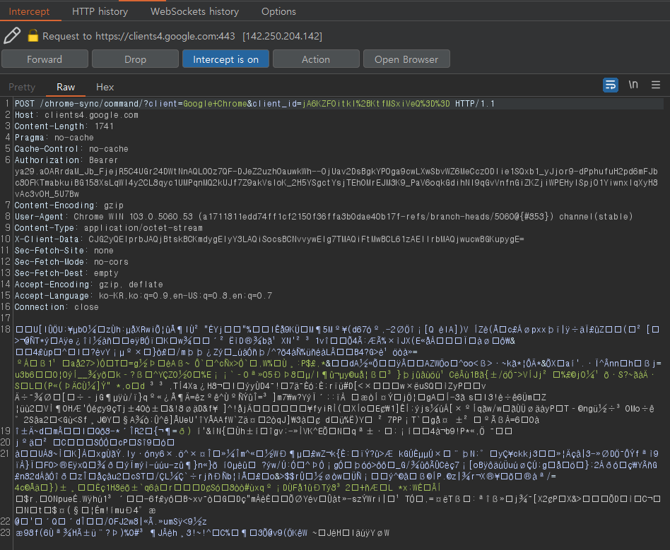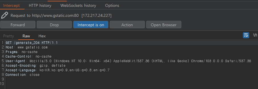 프록시 설정 on 상태에서 Intercept is on으로 전환하고 구글에 들어갔더니 이렇게 잡혔다.