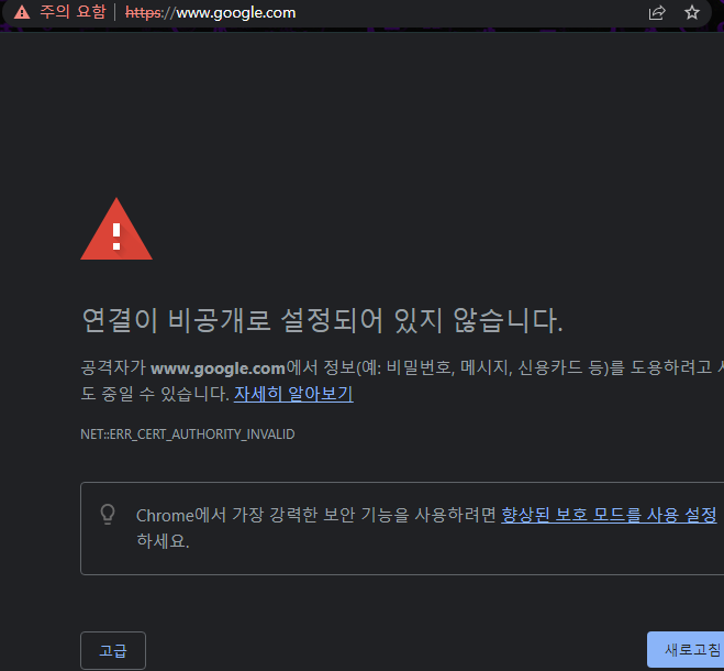 그래서 주의 요함을 클릭해봤더니 인증서가 유효하지 않다고 한다.