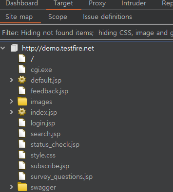 우선 Scope에 테스트용으로 네이버와 다음을 추가한 후 해당하는 도메인의 응답과 요청만을 걸러서 보여주는 것을 확인했다. 이어서 demo.testfire.net이라는 가상의 취약한 사이트에 접속 후 디렉토리와 파일 구조를 분석하는 실습이 있었다.