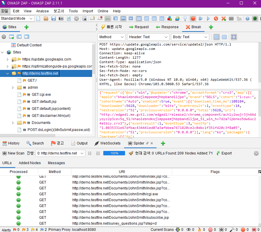아무튼 demo.testfire.net 도메인을 대상으로 Spider를 돌렸다.