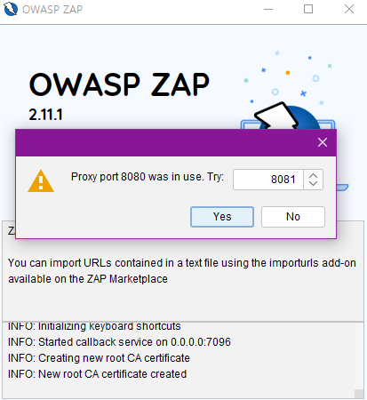 프록시 포트 8080이 이미 사용되고 있다고 한다. 버프스위트 프로세스가 8080을 쓰고 있어서 그렇다.