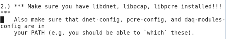 "인스톨하기 위해선 libdnet, libpcap, libpcre가 필요하다. 또한 그것들을 make하기 위해선 dnet-config, pcre-config, daq-modules-config가 패치되어 있어야 한다. 너는 which를 사용할 수 있어야 한다."